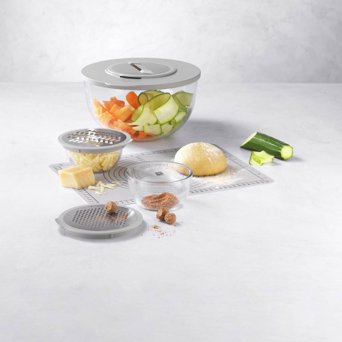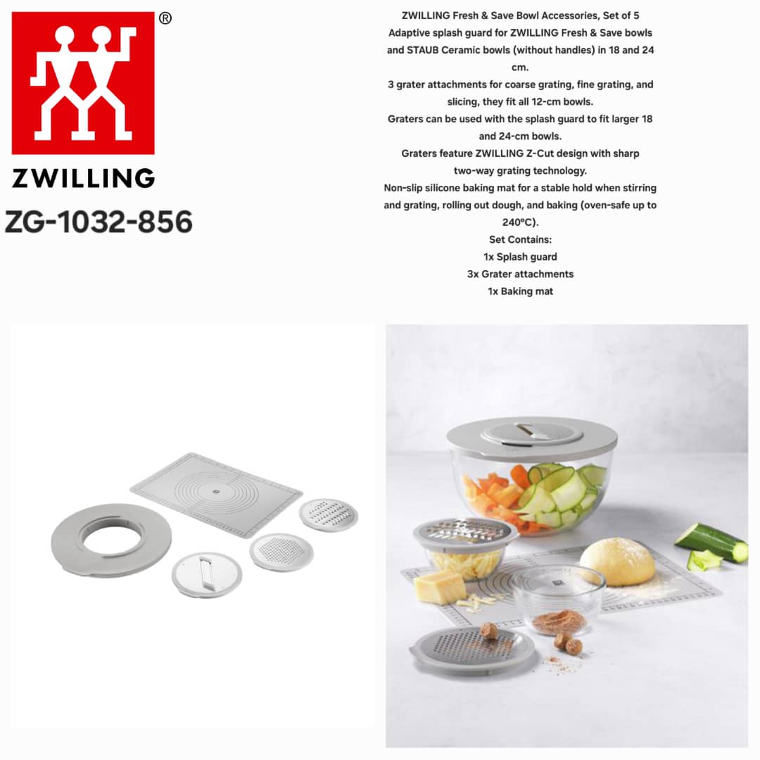 مجموعه لوازم جانبی برای کاسههای ZWILLING FRESH & SAVE BOWLS به همراه محافظ پاشش آب، ۳ عدد رنده و زیرانداز سیلیکونی ضد لغزش مناسب فر
