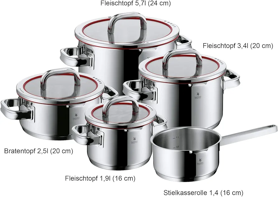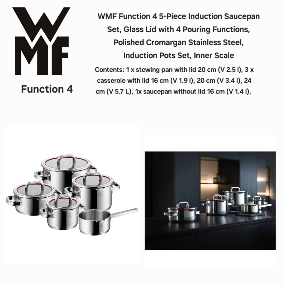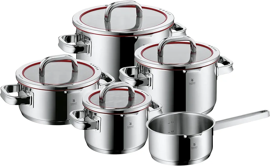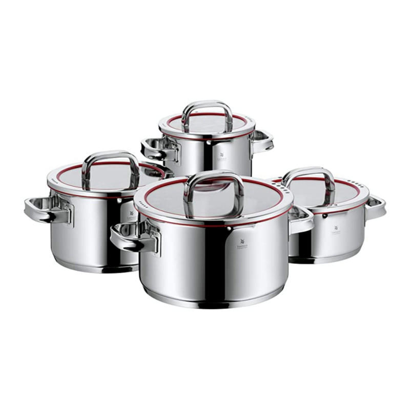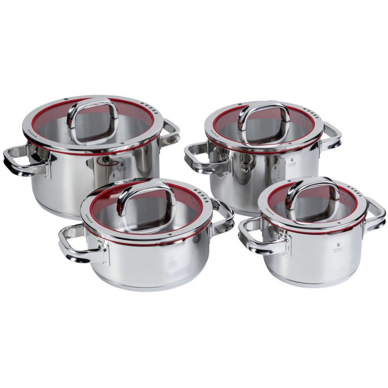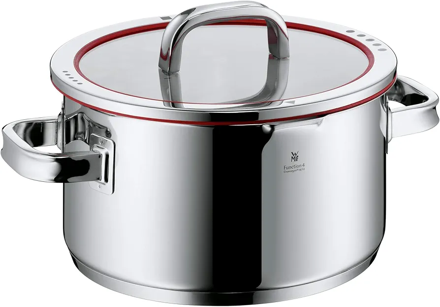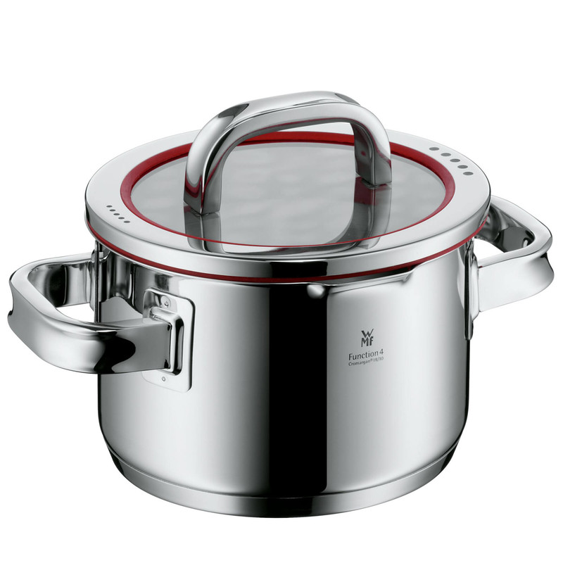 سرویس قابلمه WMF Fanction4 از ۸ قطعه ساخته شده از فولاد ضد زنگ درب آن از سیلیکون و شیشه است و دارای ۴ نوع خروجی آب و بخار می باشد که سیلیکون درب مقاوم در برابر حرارت است و همچنین دسته های قابلمه در طول پخت و پز داغ نمی شوند ، غذای خود را هنگام پخت به دلیل درب شیشه ای به راحتی کنترل کنید .