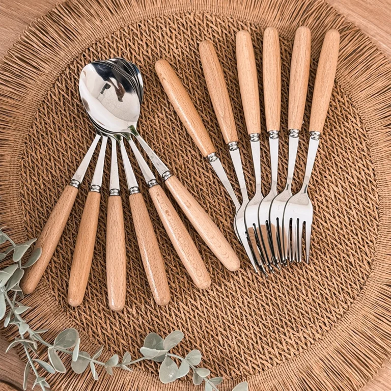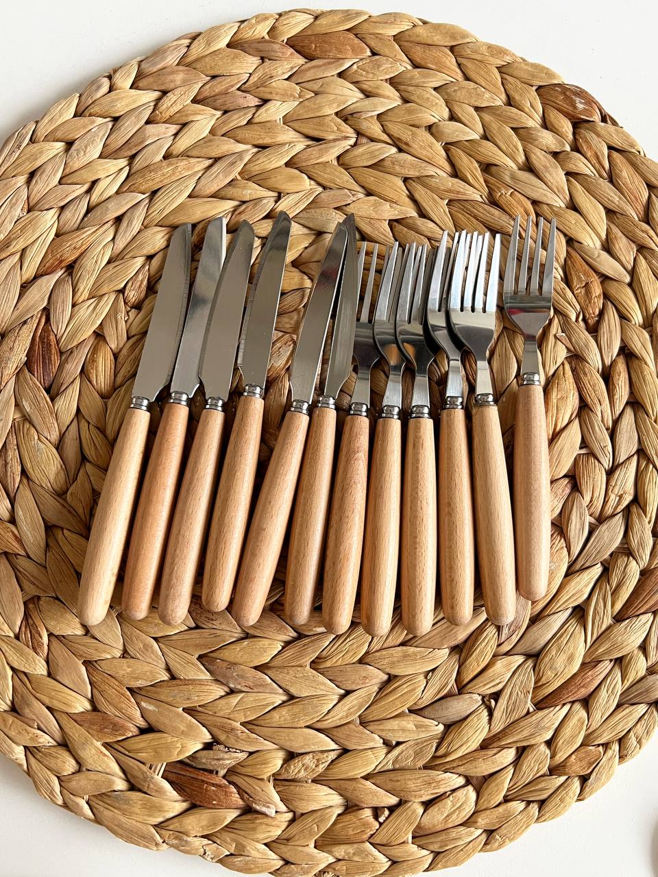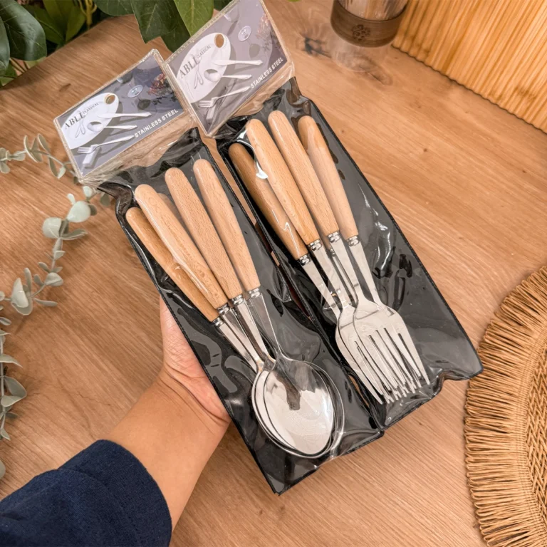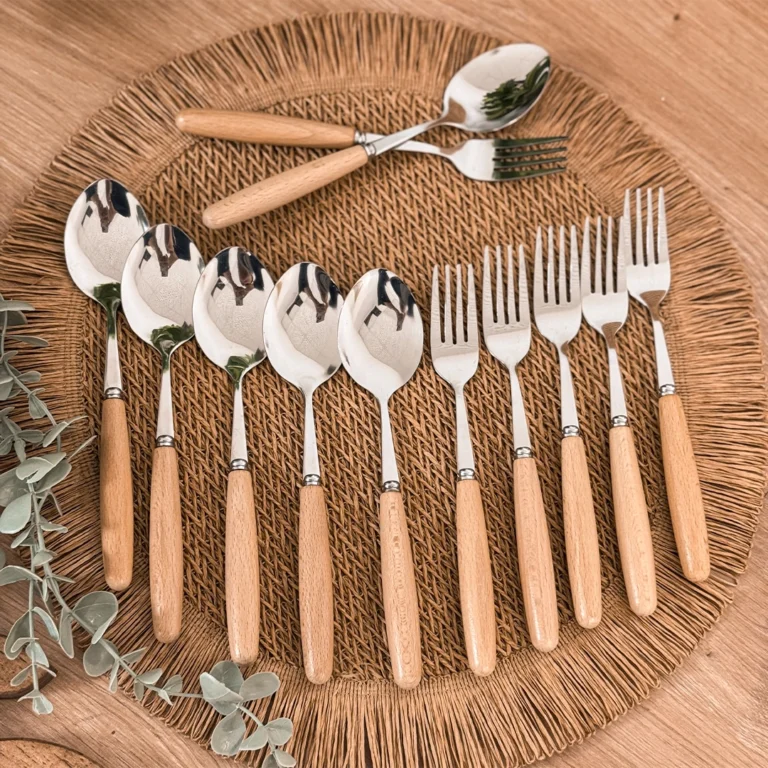 • توضیحات: قاشق چنگال دسته بامبو محصول بسیار باکیفیت و وارداتی جنس دسته:چوب بامبو مناسب غذاخوری ارتفاع هر عدد قاشق یا چنگال 19سانت در هر بسته ی قاشق۶ عدد میباشد. درهر بسته ی چنگال ۶عدد میباشد در هر بسته ۶ عدد چاقو میباشد