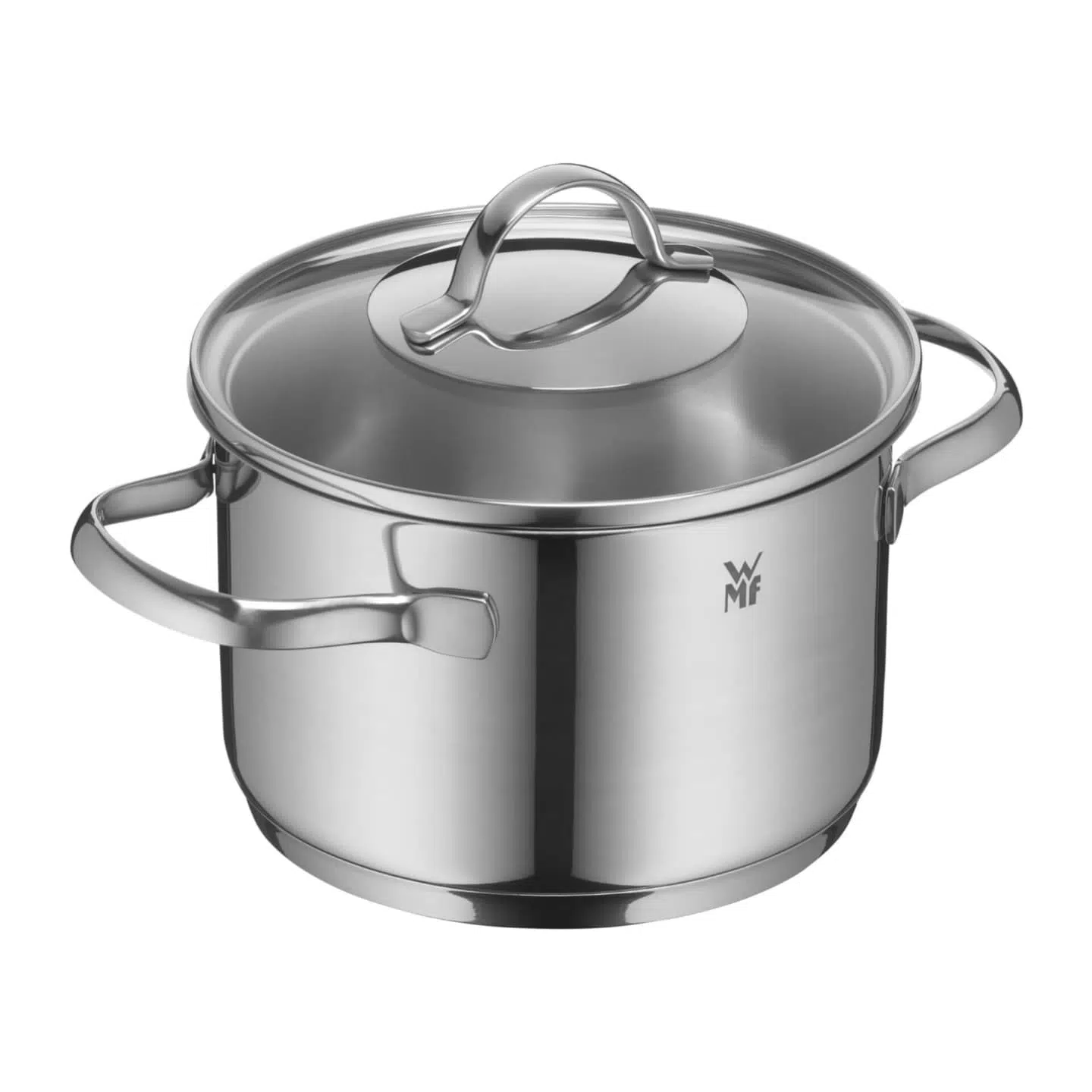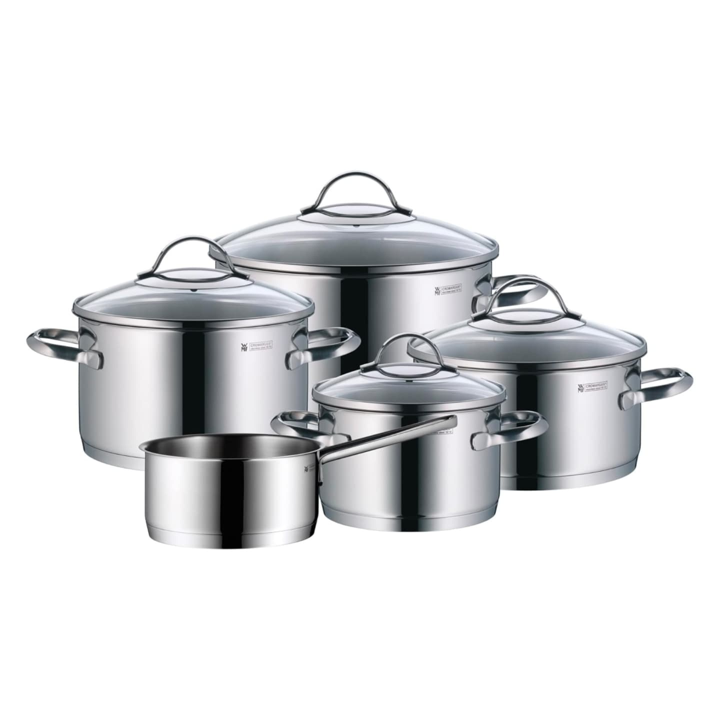 سرویس قابلمه 9 پارچ استیل دبلیو ام اف مدل WM-07-2055-6030، ظروف پخت و پز استیل ضد زنگ 18/10 با پایه Trans Therm، درب سنگین با دریچه بخار، لبه ریختن ضد چکه، قابل استفاده روی همه اجاقها و فر تا 250 درجه سانتیگراد