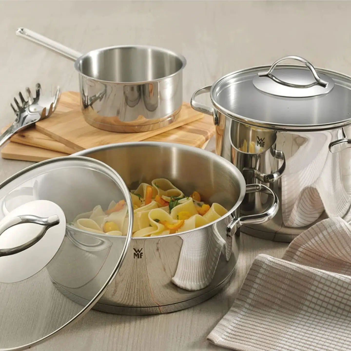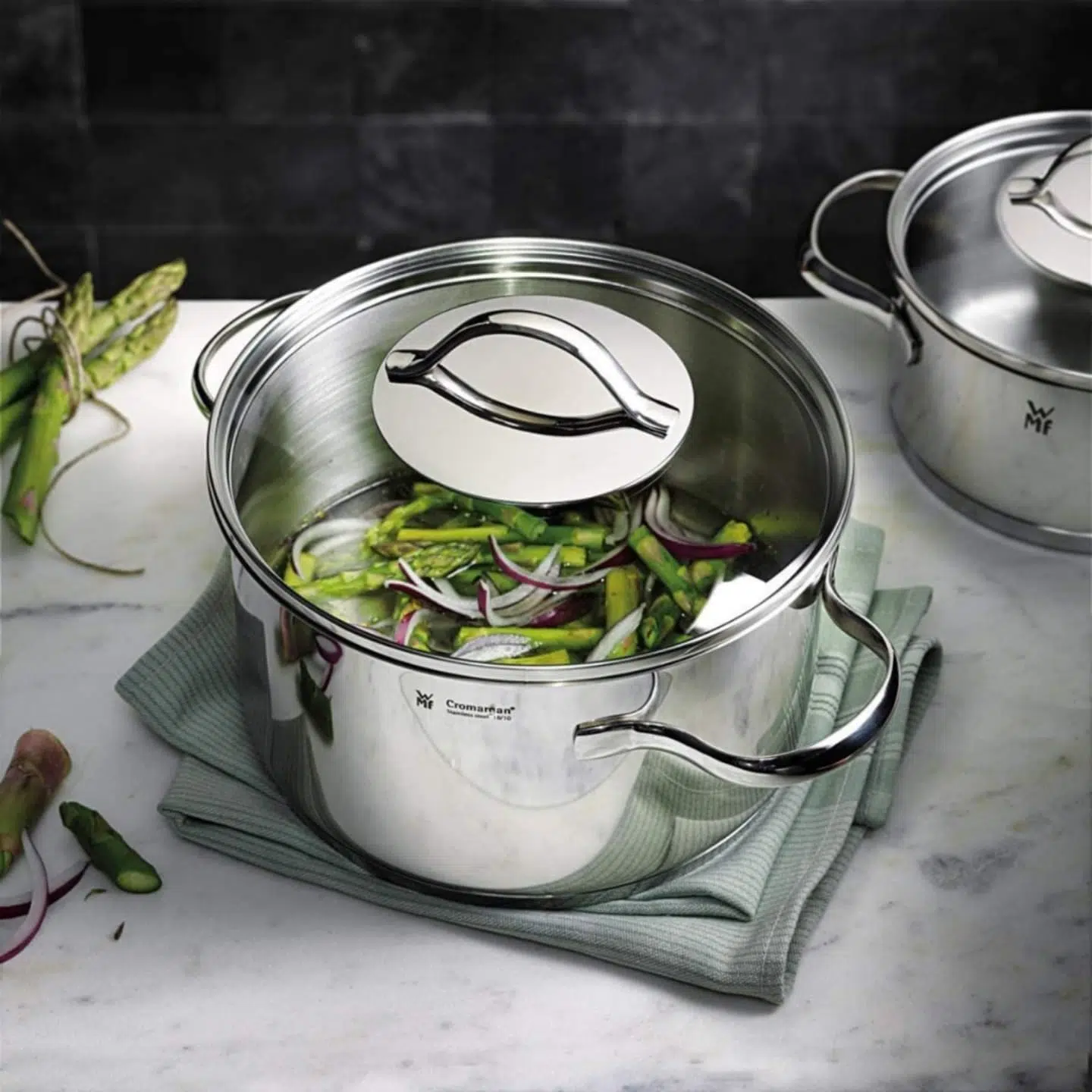 اگر به دنبال مجموعهای هستید که کیفیت، دوام و کارایی حرفهای را در آشپزخانه شما به ارمغان بیاورد، WMF WM-07-2055-6030 انتخابی بینظیر است. این مجموعه با استفاده از استیل ضد زنگ کرومارگان 18/10 ساخته شده که علاوه بر ظاهری براق و لوکس، مقاومت فوقالعادهای در برابر خوردگی، خراش و تغییر رنگ دارد. این ویژگیها باعث میشود ظروف شما سالها با همان کیفیت اولیه قابل استفاده باشند و تجربهای بهداشتی و حرفهای در آشپزخانه فراهم کنند.