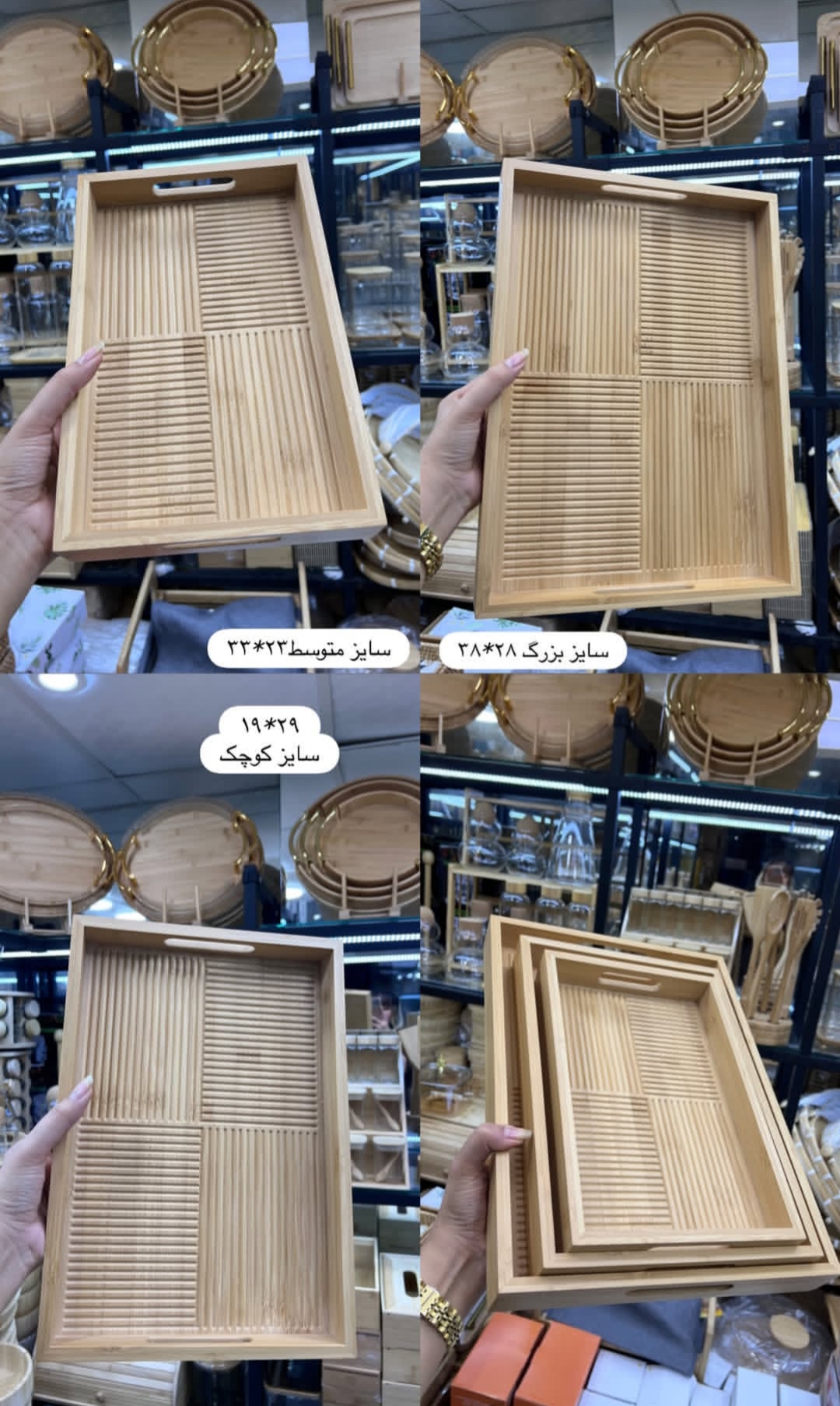 کوچک: 29×19 | متوسط: 33×23 | بزرگ: 38×28 سانتیمتر با لبه ۴.۵ سانتیمتری