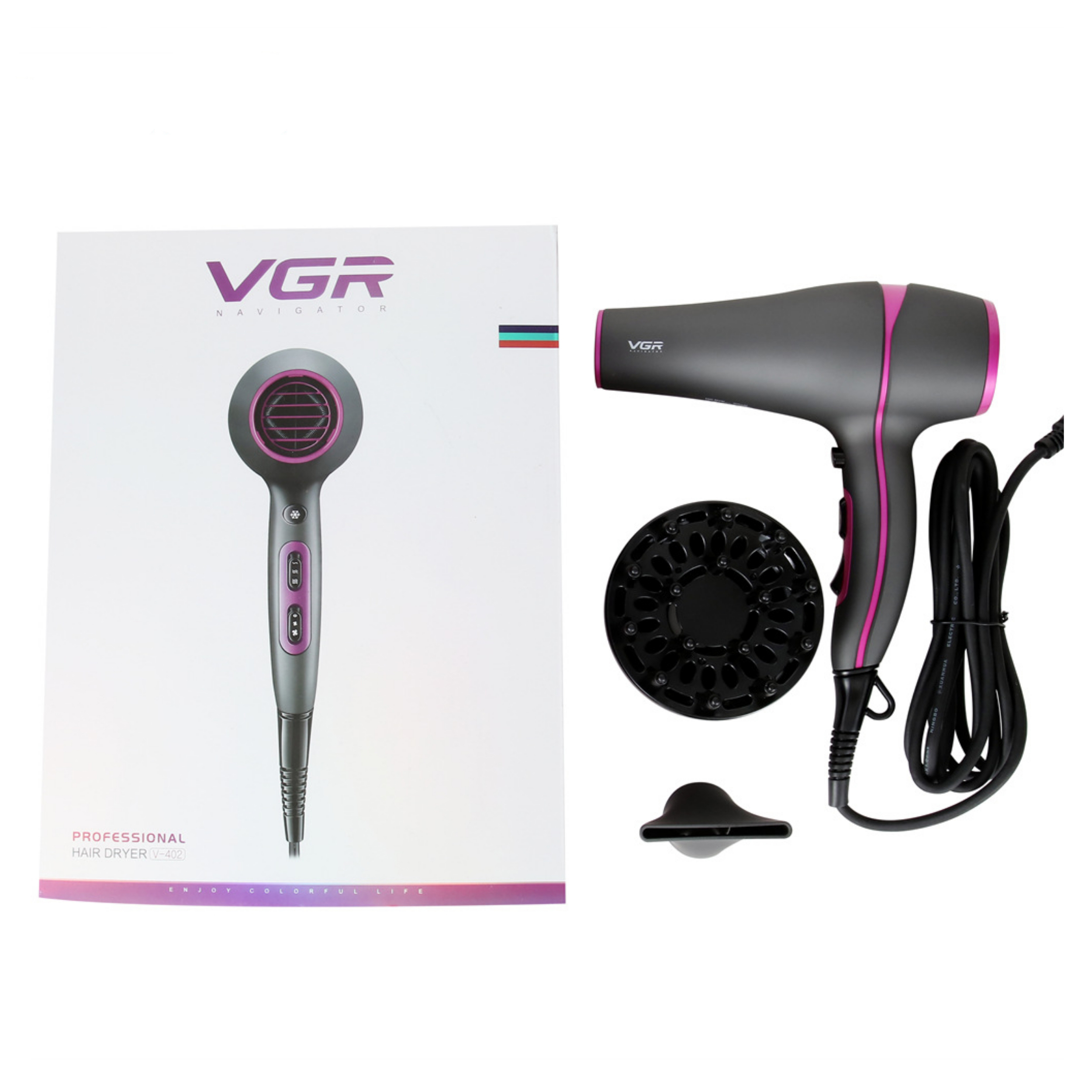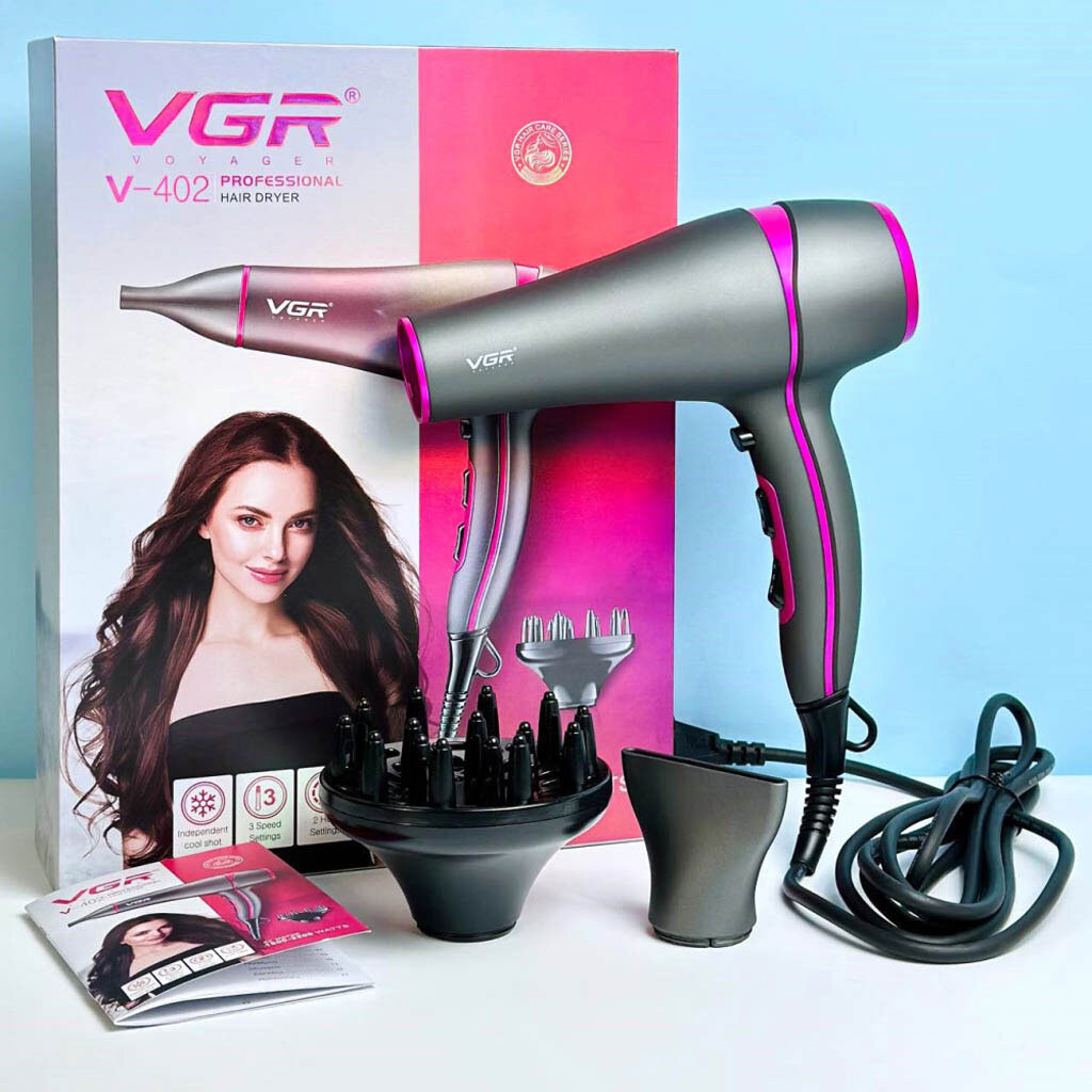 سشوار وی جی آر مدل ۴۰۲ دو سرعته و دارای۲ درجه گرما و تکنولوژی جدید کلید مستقل سرما میباشد قدرت این سشوار ۲۲۰۰ وات و موتور این سشوار AC است طول کابل سشوار ۳ متر و قابل استفاده در آرایشگاه و منزل میباشد .