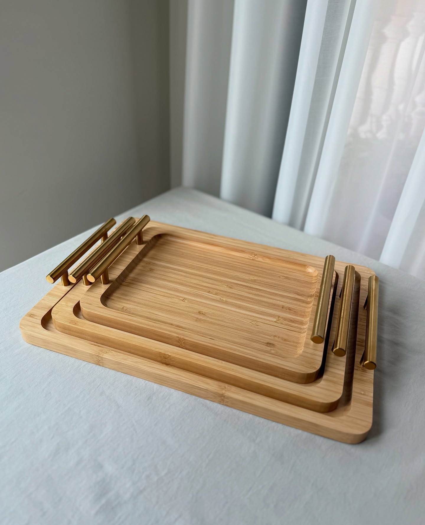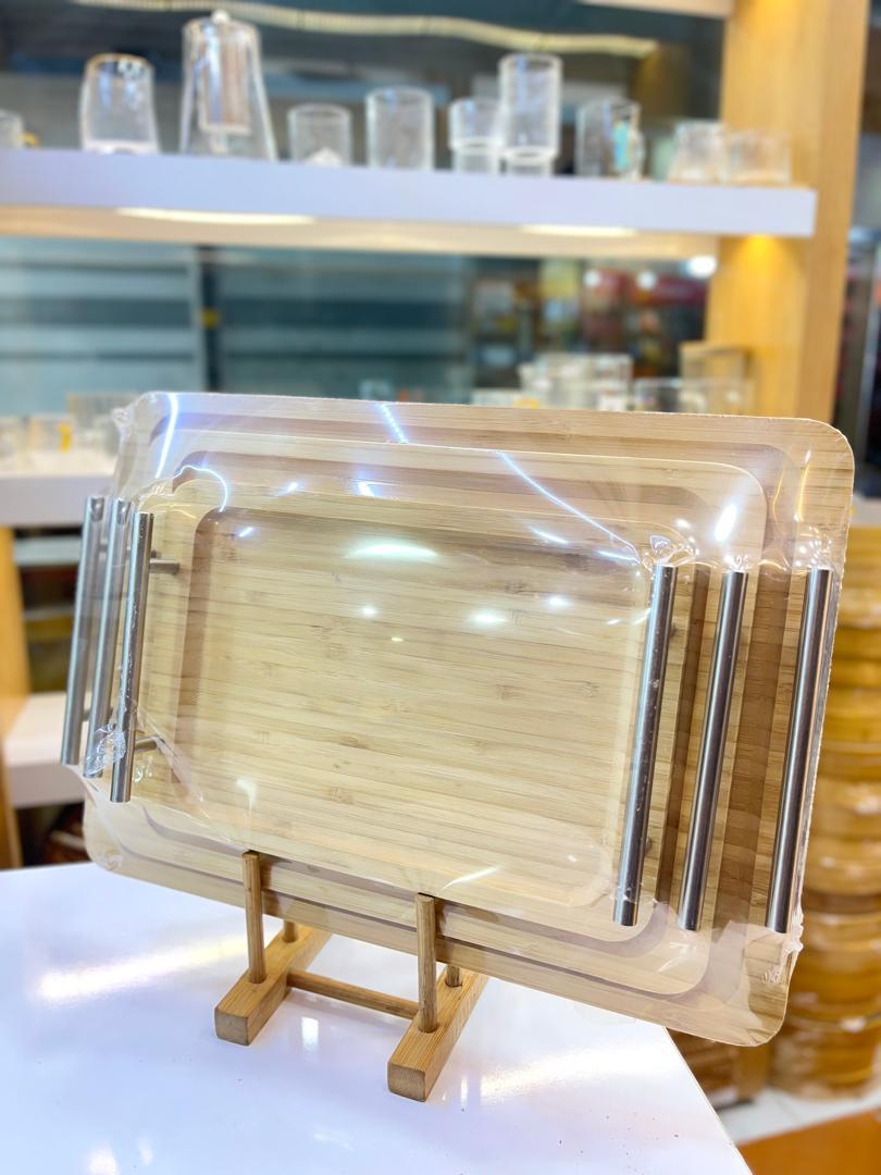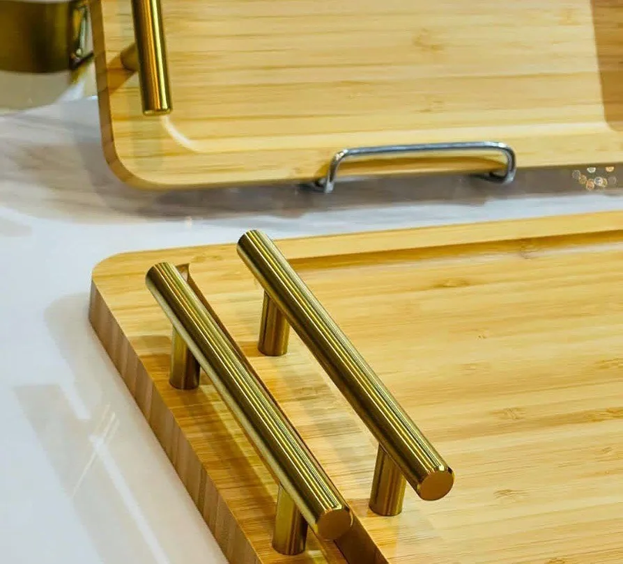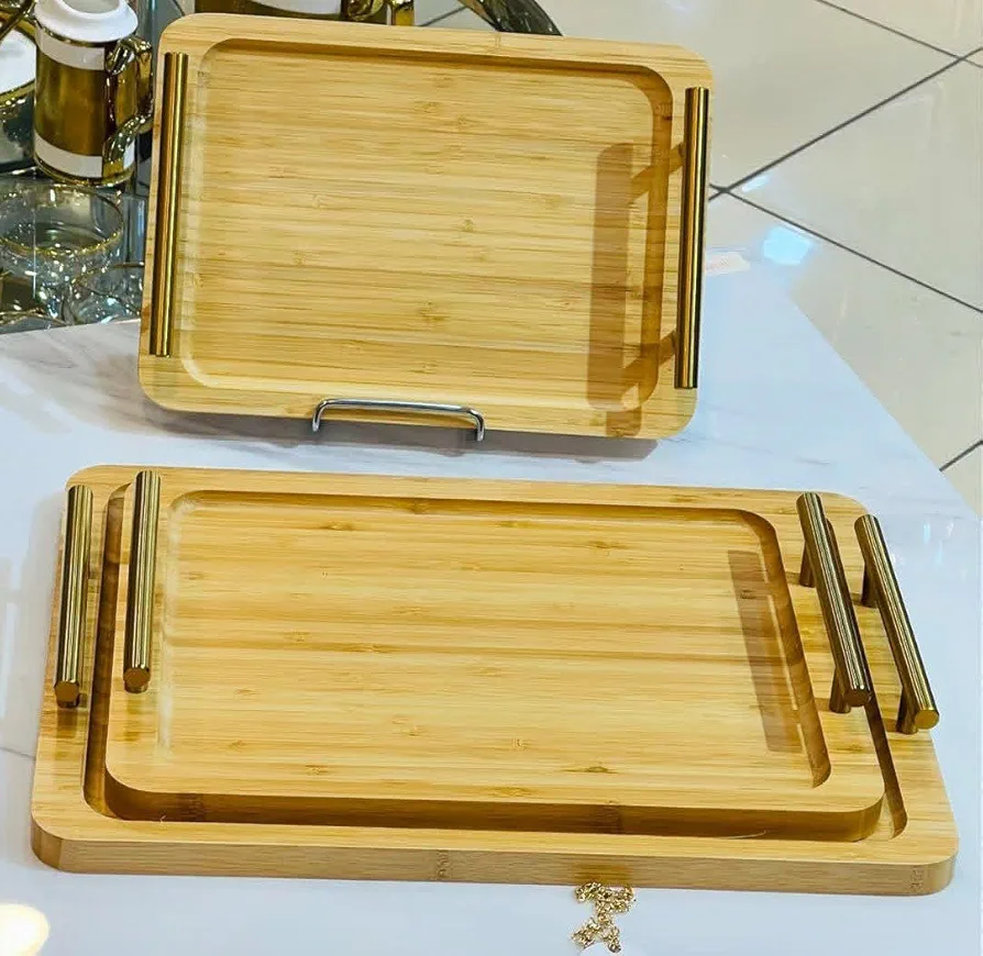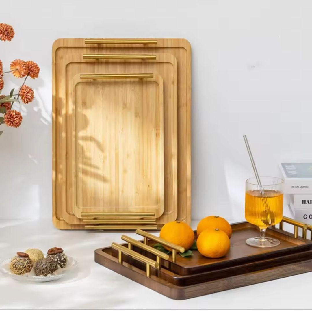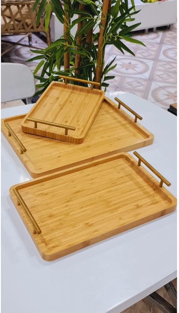 ست سینی گرد بامبو سهتکه با طراحی لوکس و دستههای فلزی طلایی، ترکیبی از زیبایی طبیعی چوب و درخشش فلز است. این سینیها نهتنها برای پذیرایی کاربردی هستند، بلکه بهعنوان اکسسوری دکوراتیو نیز جلوهای شیک به فضای آشپزخانه یا میز شما میبخشند.