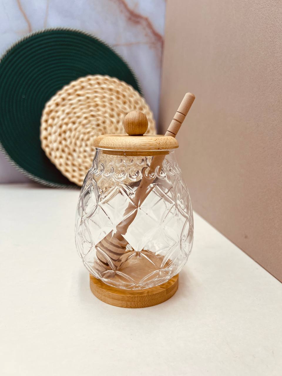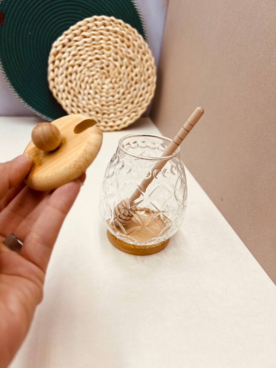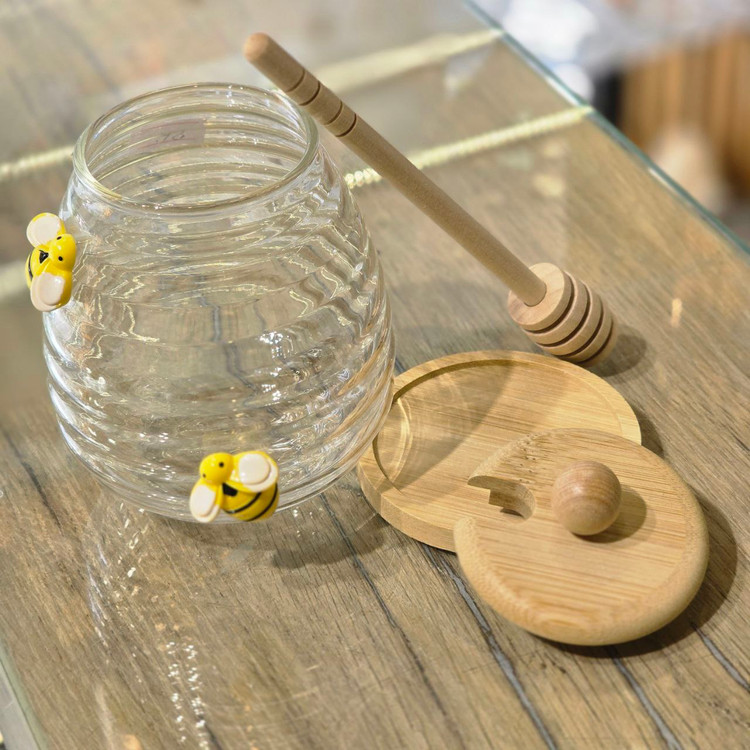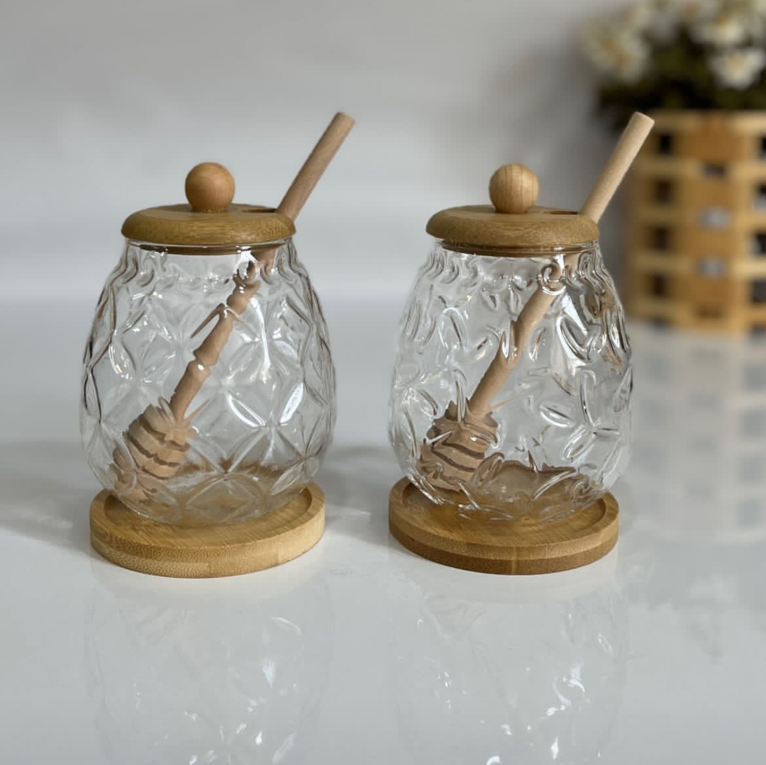 • توضیحات: از جنس شیشه پیرکس بی رنگ مدل نقش برجسته طرح زنبور‌دار و لوزی با قاشق عسل خوری چوبی سایز بزرگ همراه با زیره چوبی گرد درب با محفظه برای قرار گیری قاشق مناسب برای نگهداری و سرو عسل و ارده شیره مناسب برای سرو و پذیرایی در منزل، هتل و