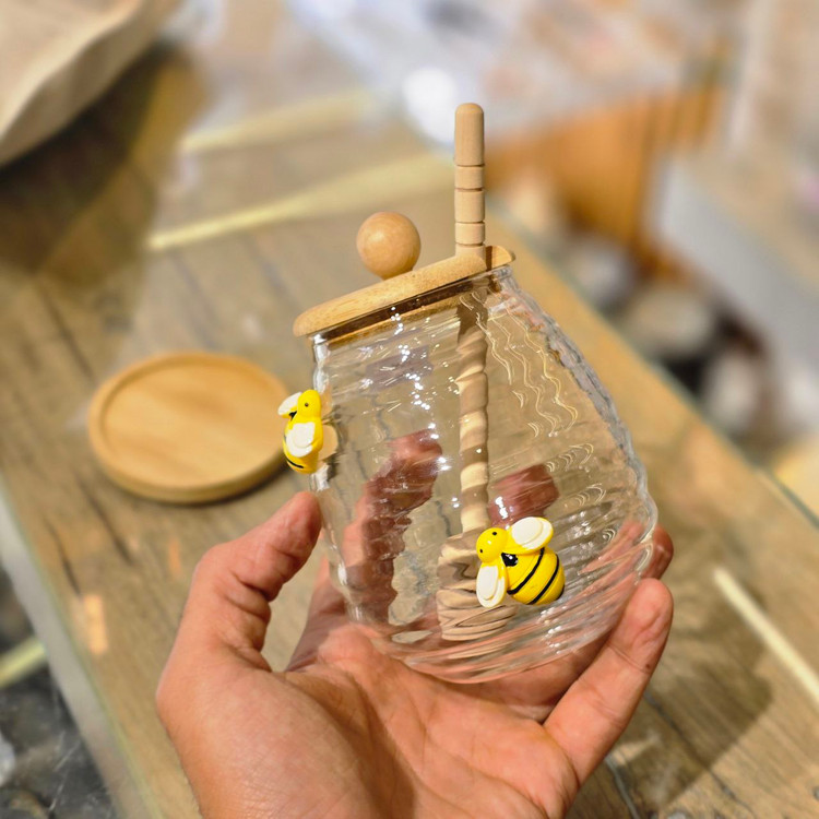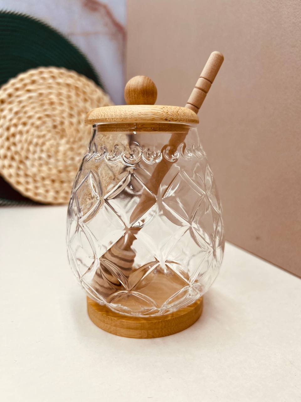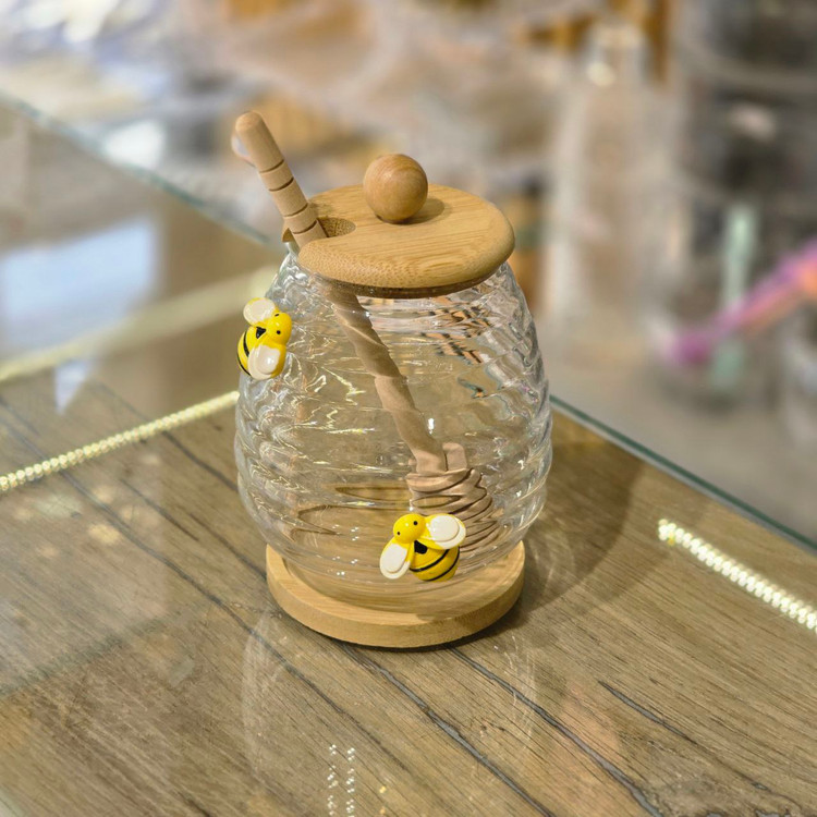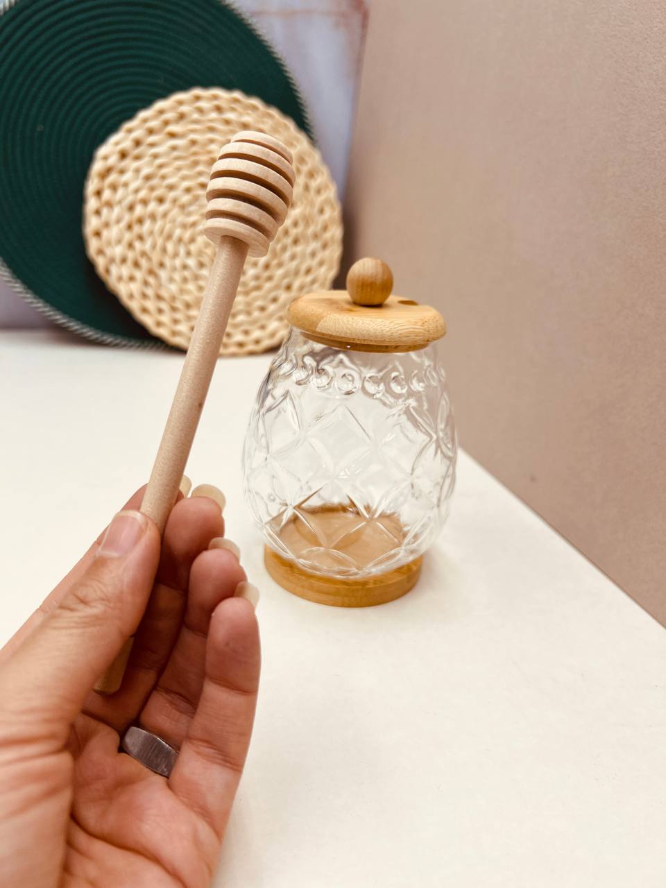 • توضیحات: از جنس شیشه پیرکس بی رنگ مدل نقش برجسته طرح زنبور‌دار و لوزی با قاشق عسل خوری چوبی سایز بزرگ همراه با زیره چوبی گرد درب با محفظه برای قرار گیری قاشق مناسب برای نگهداری و سرو عسل و ارده شیره مناسب برای سرو و پذیرایی در منزل، هتل و