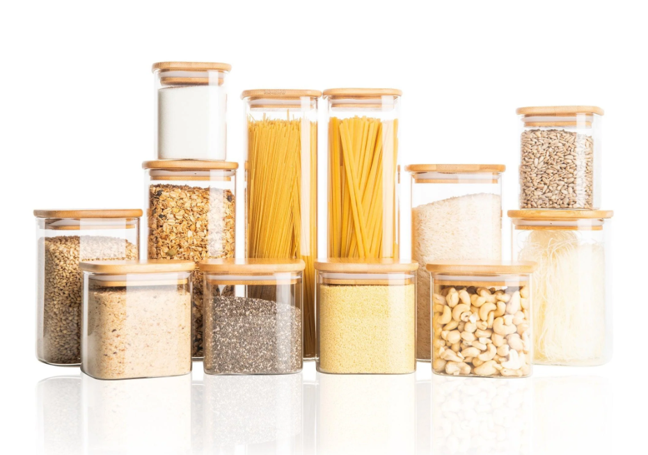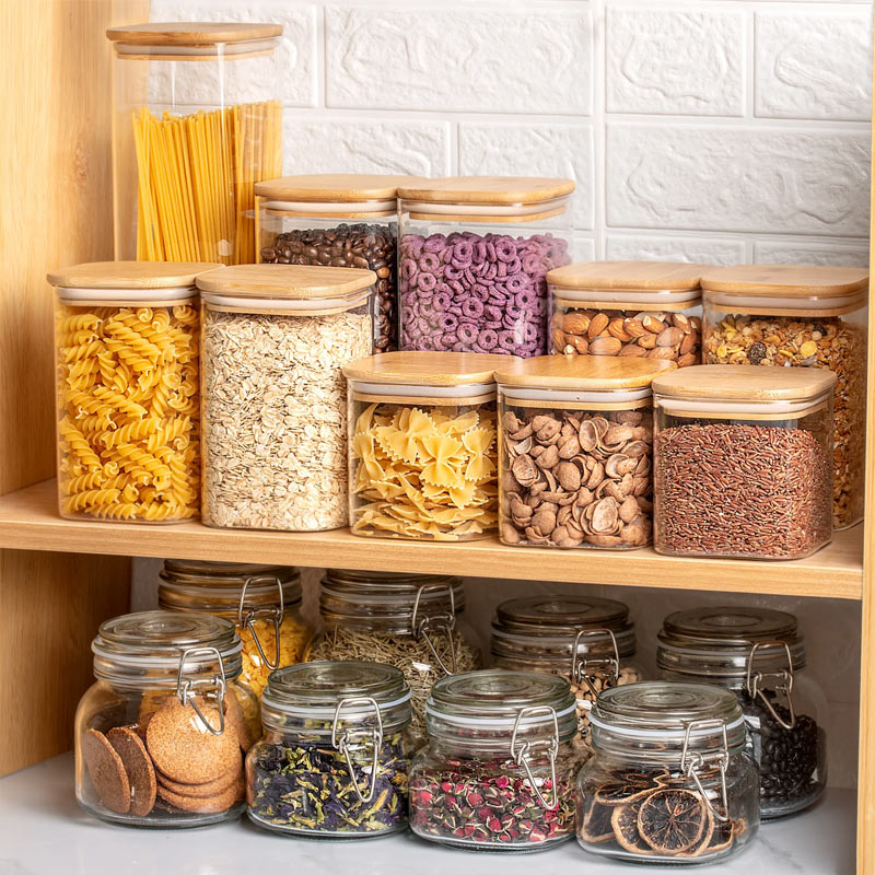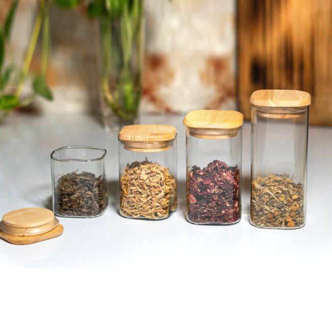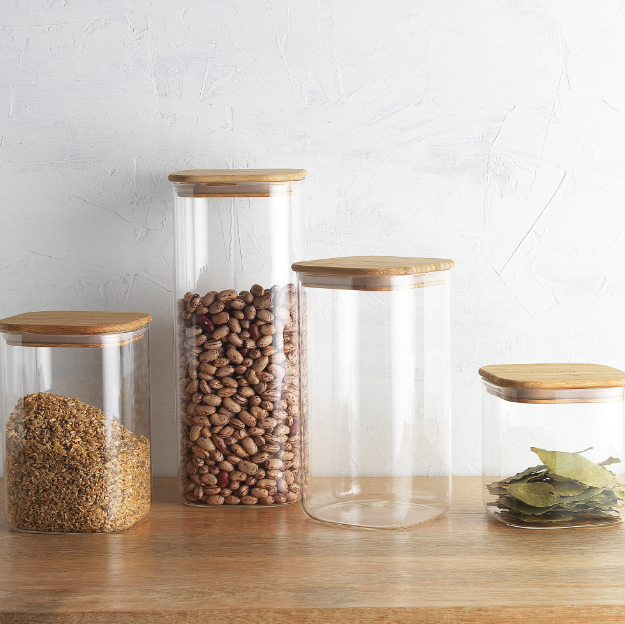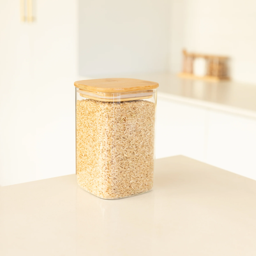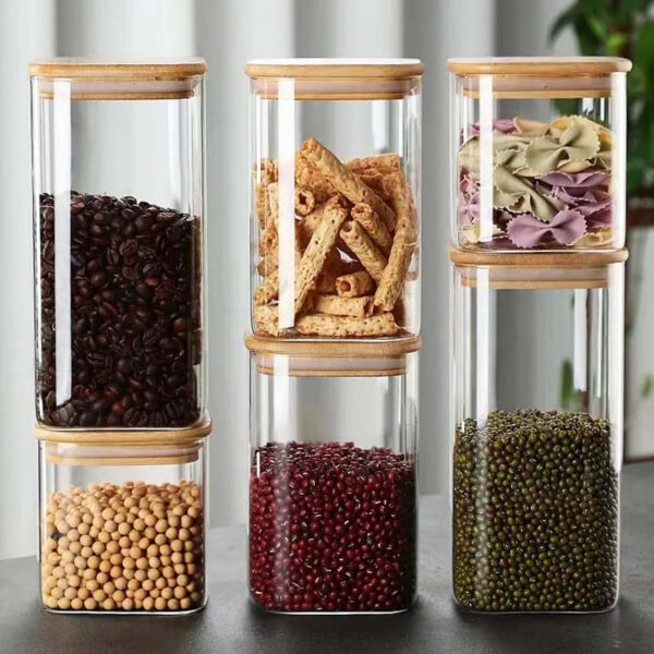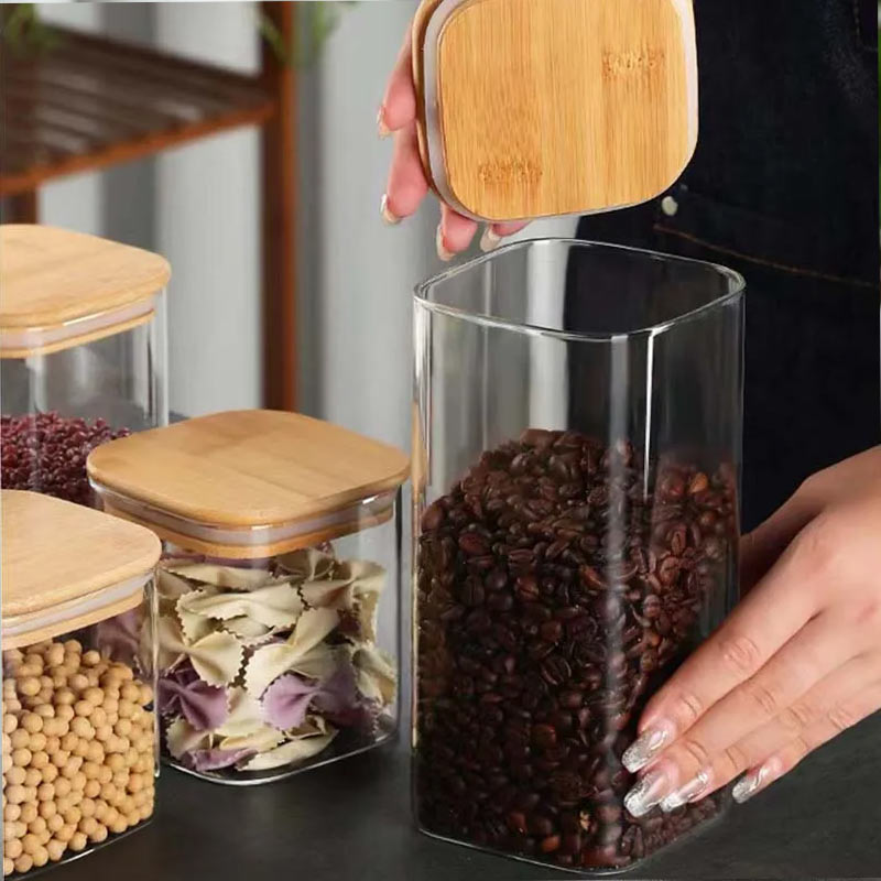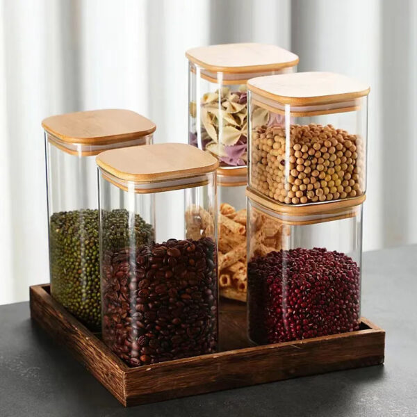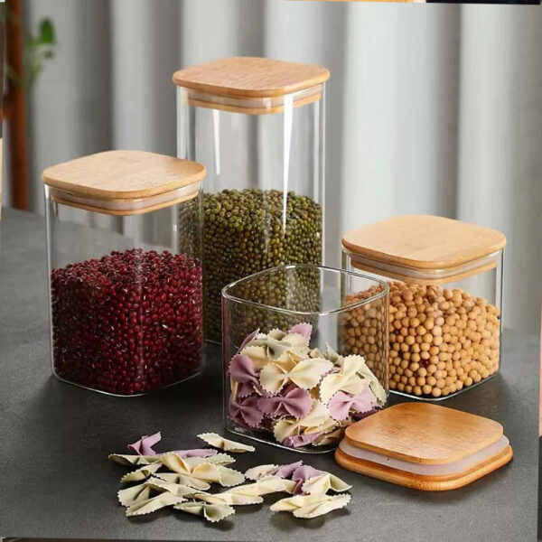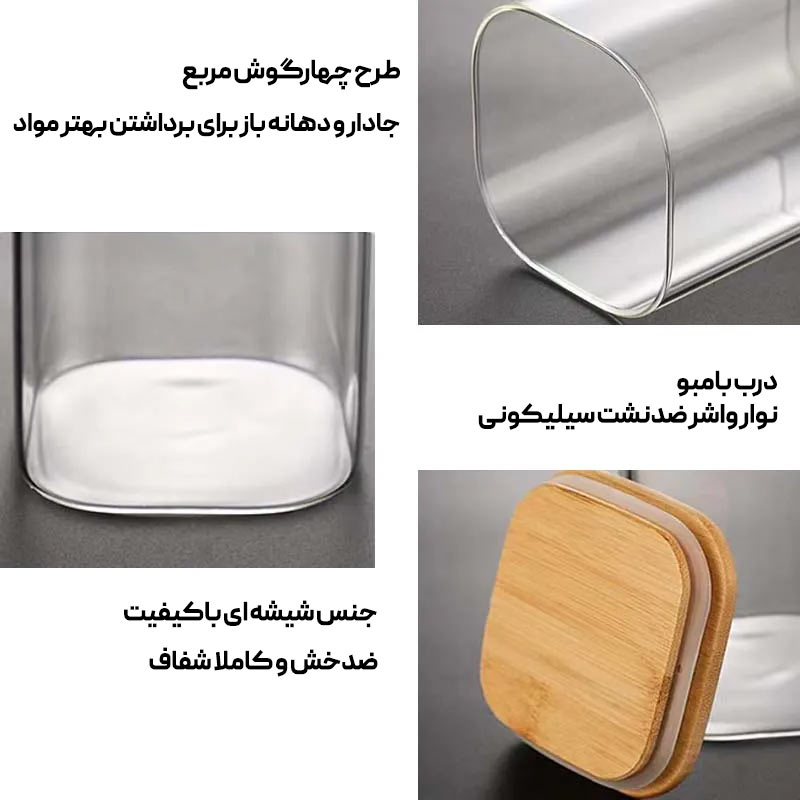 بانکه مربعی پیرکس با درب بامبو پاپا | طراحی شفاف و مدرن برای آشپزخانهای منظم