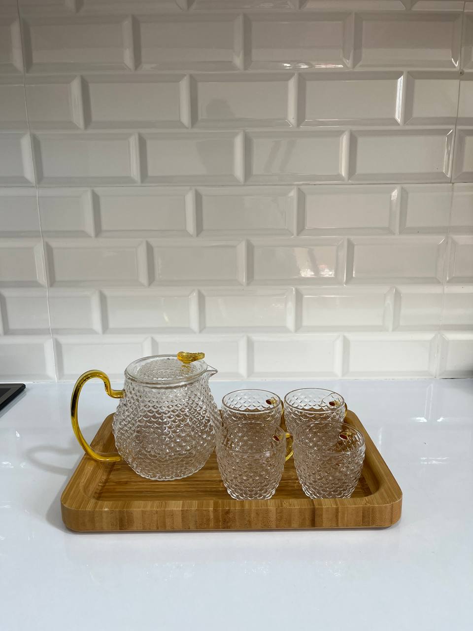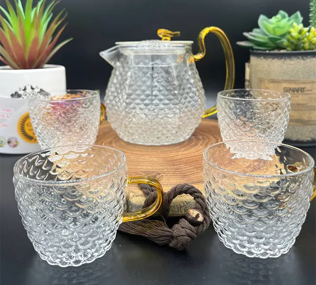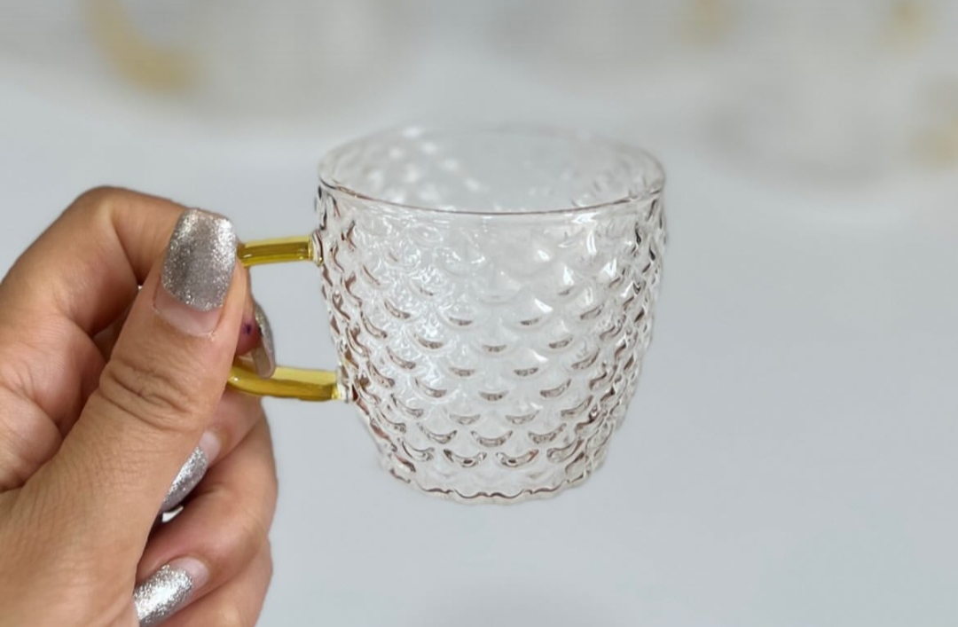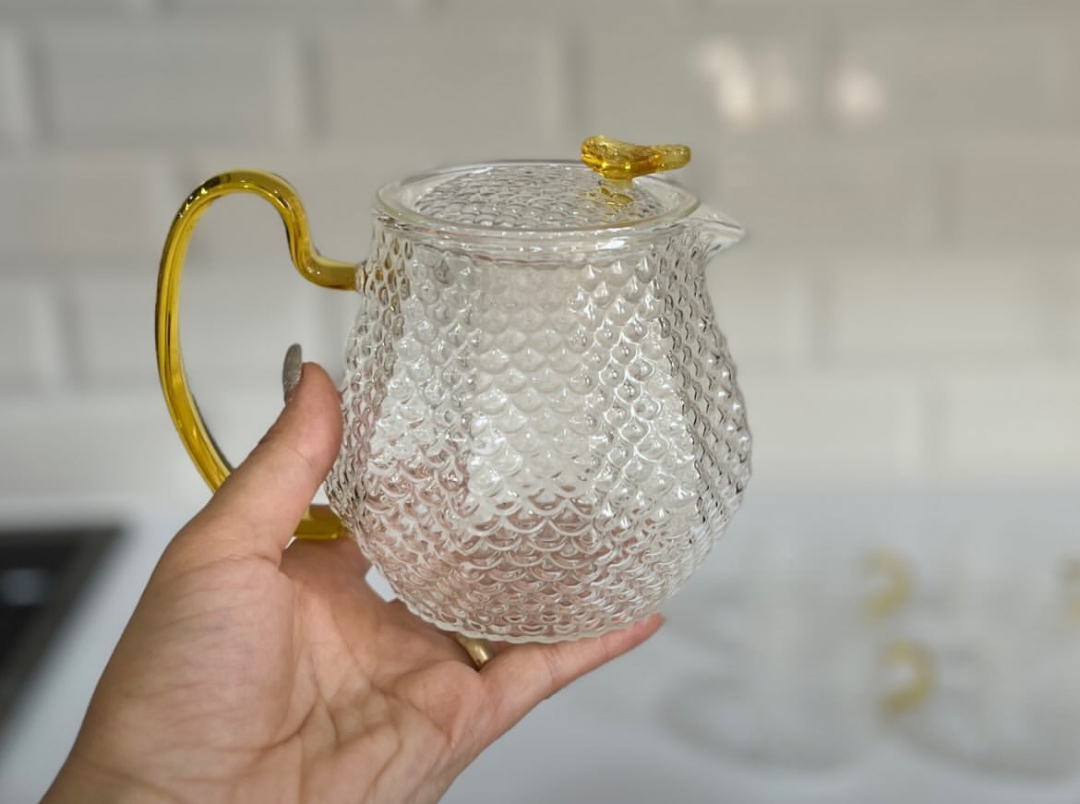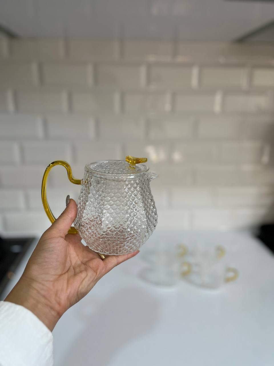 • توضیحات: 4 فنجان و یک قوری ضخیم و شفاف طرح نقش برجسته پولک با دسته‌های طلایی رنگ قوری دارای صافی شیشه‌ای شعله مستقیم و آنتی شوک حرارتی قابل استفاده در منزل، کافی‌شاپ، هتل و … واردتی ✈️