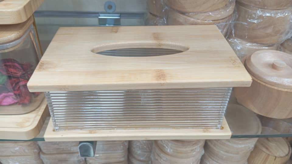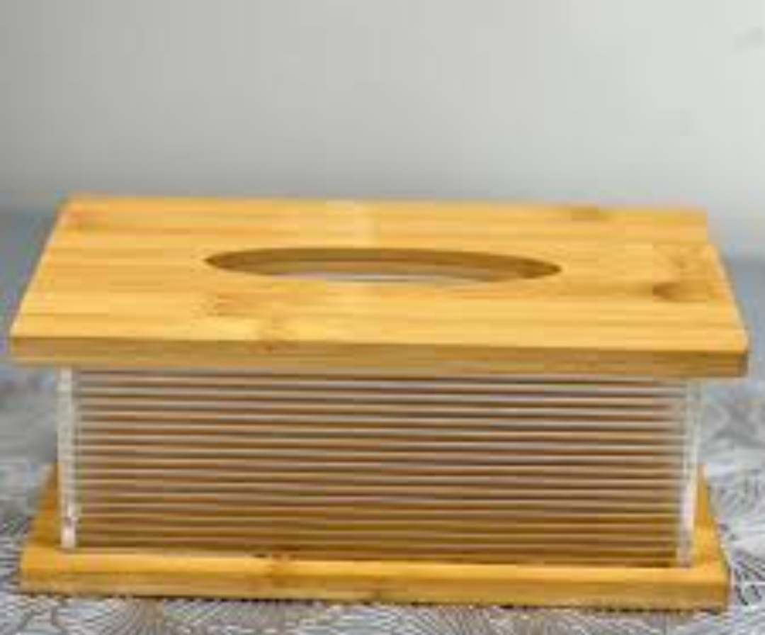 این جعبه ترکیبی از چوب بامبو در قسمت بالا و پایین و پلاستیک شفاف (احتمالاً اکریلیک) در بدنه است.