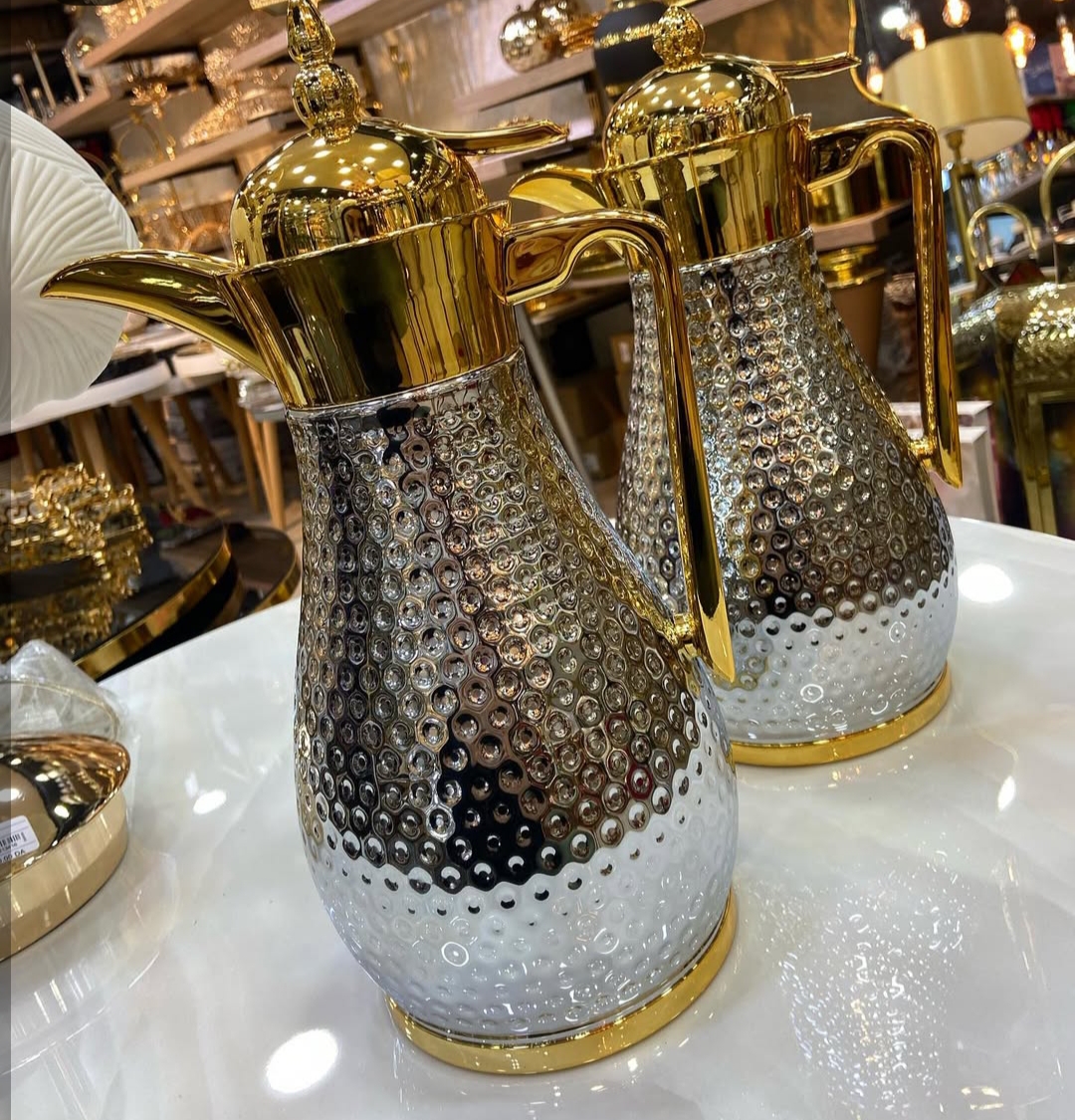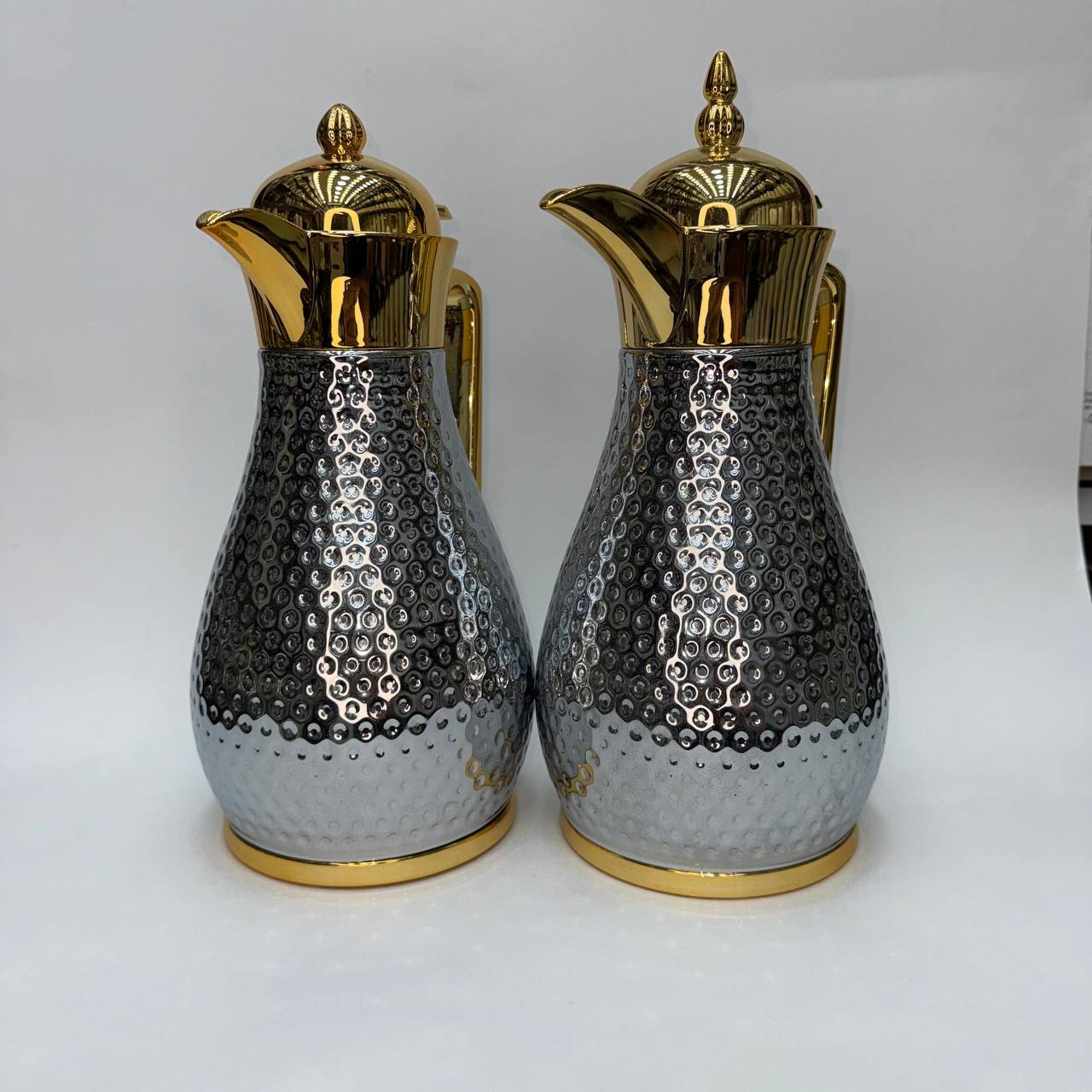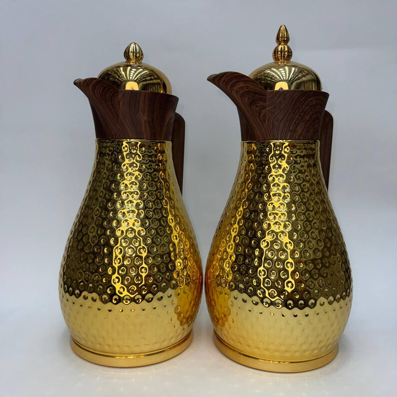 فلاسک طلایی و نقره ای رنگ با طرح چکشکاری شده و قسمت بالایی چوبی است.